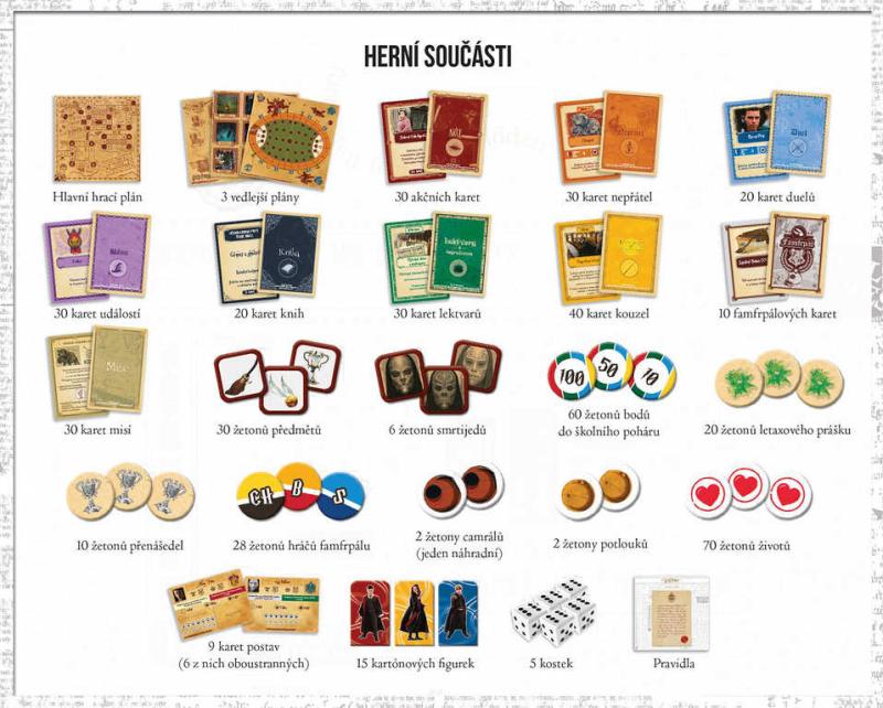 40 karet kouzel, 10 famfrpálových karet, 30 karet misí)