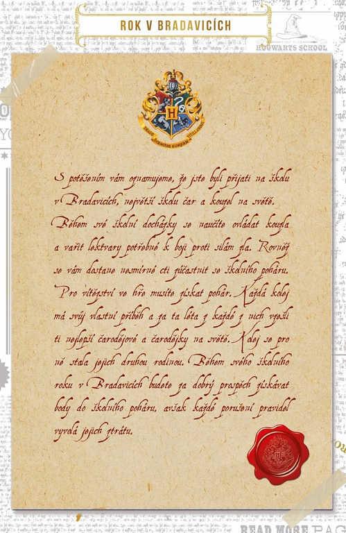 S potěšením vám oznamujeme, že jste byli přijati na školu čar a kouzel v Bradavicích. Během své školní docházky se naučíte ovládat kouzla a vařit lektvary potřebné k boji proti silám zla. Rovněž se vám