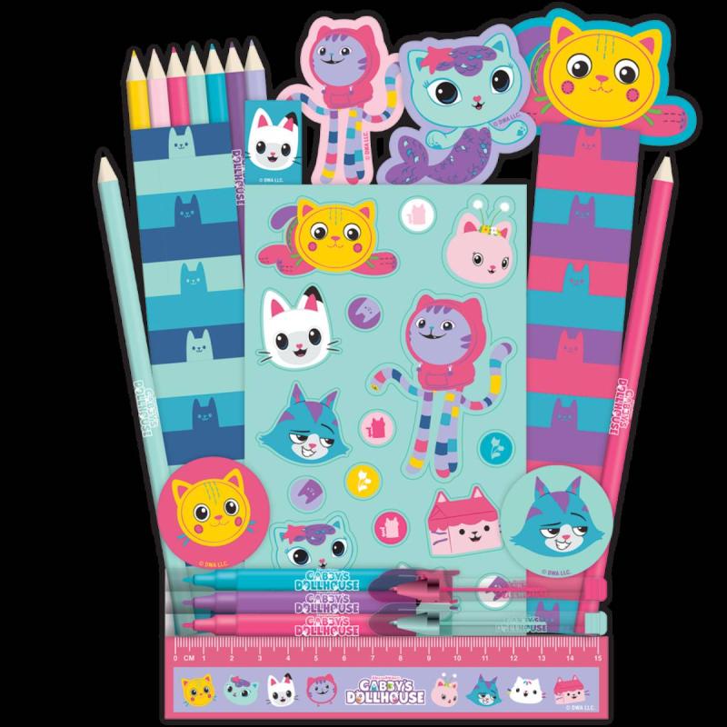 Kalendář obsahuje: 1× pravítko (15 cm), 1× ořezávátko, 2× gumy, 2× záložky, 3× mini vodové fixy, 7× mini pastelky, 2× mini gelová pera, 2× tužky HB, 3× magnetky, 1× arch se samolepkami.