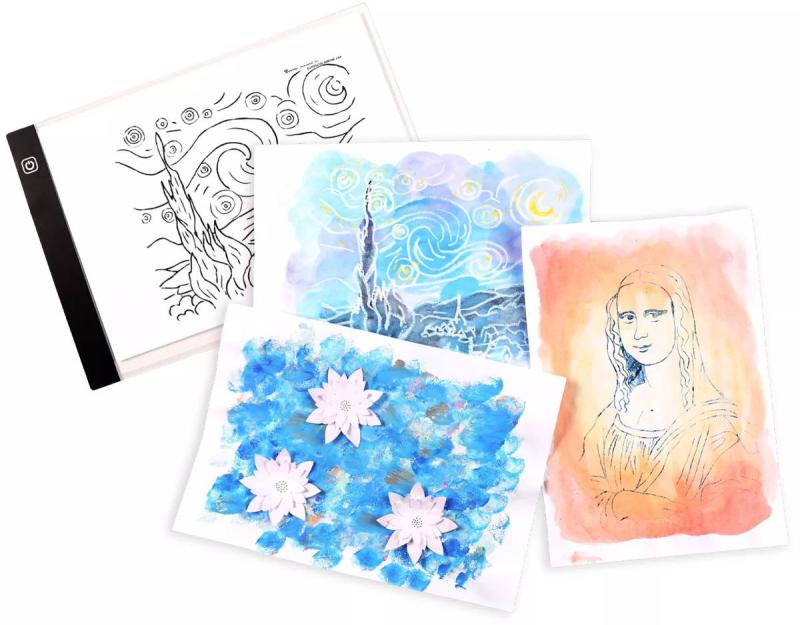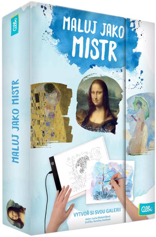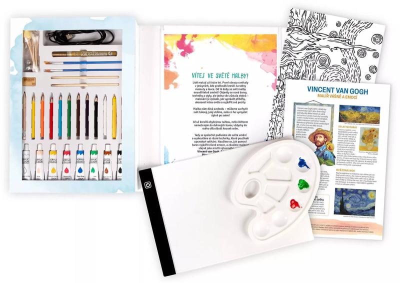 S malovací sadou se malí umělci a umělkyně mohou inspirovat 13 významnými světovými malíři, jakými byli Vincent van Gogh, Claude Monet, Frida Kahlo nebo Andy Warhol a vyzkoušet si jejich jedinečné styly a techniky krok za krokem díky jednoduchým návodům a přiloženým šablonám. Se svíticí LED tabulkou, která se dobíjí přes USB kabel, mohou děti podle návodu obkreslovat známá díla a vytvářet tak kousky poddobné těm mistrovským! V pracovním sešitě se dozví základní principy malby (o světle, tvarech, struktuře....), umělecké směry, stručné životopisy vybraných umělců a zajímavé informace o barvách a barevném spektru. Sada obsahuje štětce, barvy, pastelky a vše ostatní, co je k tvorbě potřeba.