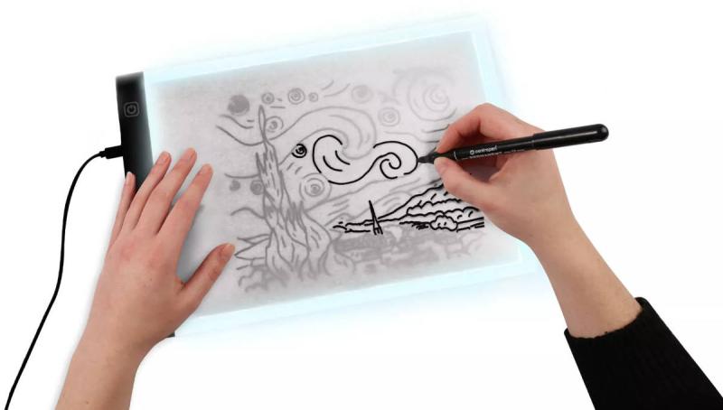 Balení obsahuje: LED svíticí kreslící tabulku, USB kabel, 8 pastelek, 3 voskové pastelky, 8 akrylových barev, 2 štětce, houbičkový štětec, 2 bambusové tyčinky na vyškrabávání, 6 vatových tyčinek, tužku, gumu, plastovou paletu, zlatý akrylový popisovač, kovové kuličky a pracovní blok s návody a barevnými papíry