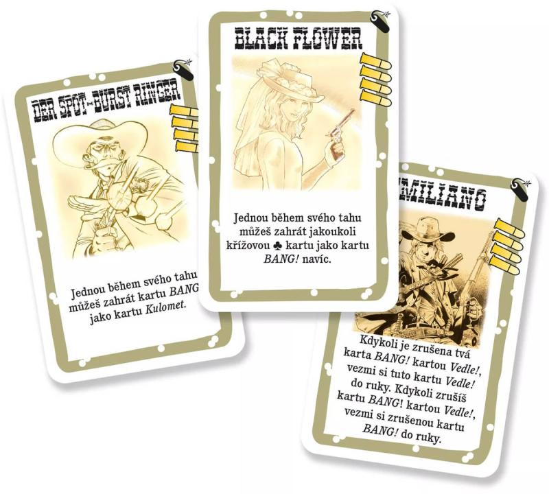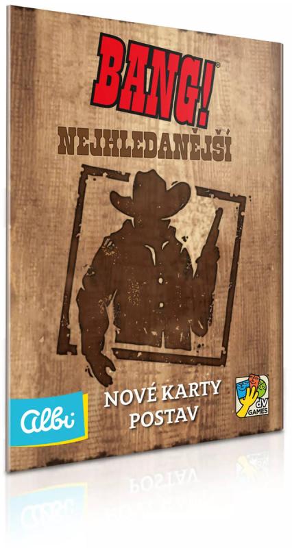 ALBI Společenská hra Bang! - Nejhledanější (rozšíření ke hře).Dobrá zpráva pro fanoušky hry Bang! Nové postavy z plného Dynamite Boxu nyní samostatně k prodeji v podobě mini rozšíření Nejhledanější. Bang! Nejhledanější je mini rozšíření pro karetní hru Bang!, které obsahuje 5 nových postav a 4 prázdné karty k dotvoření (2 herní karty a 2 karty postav).