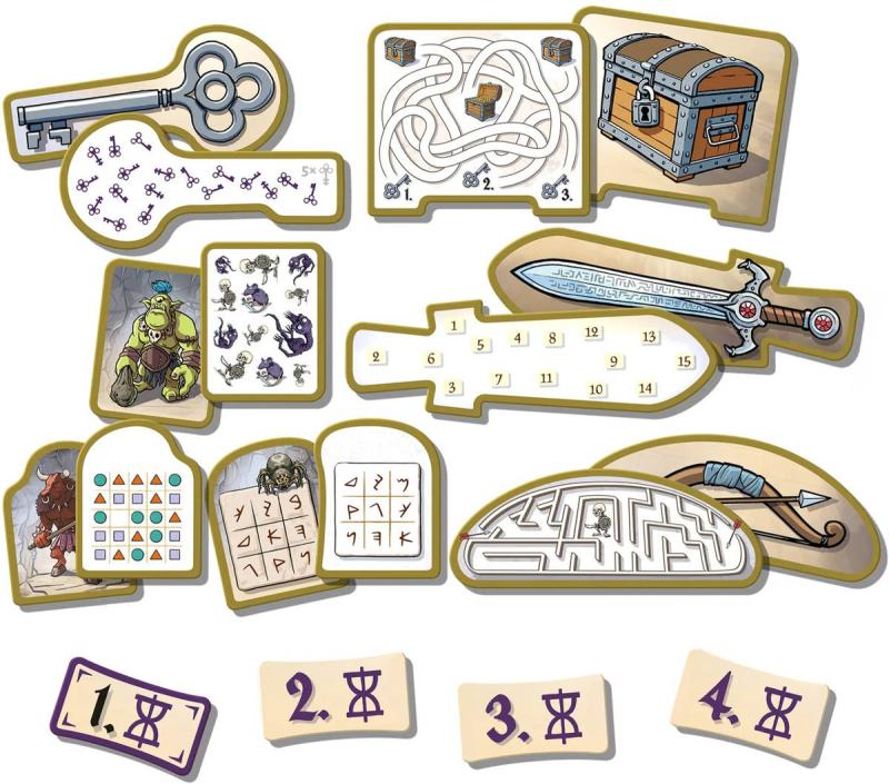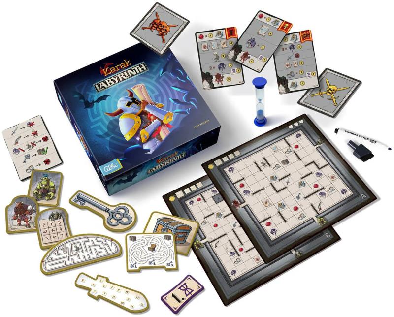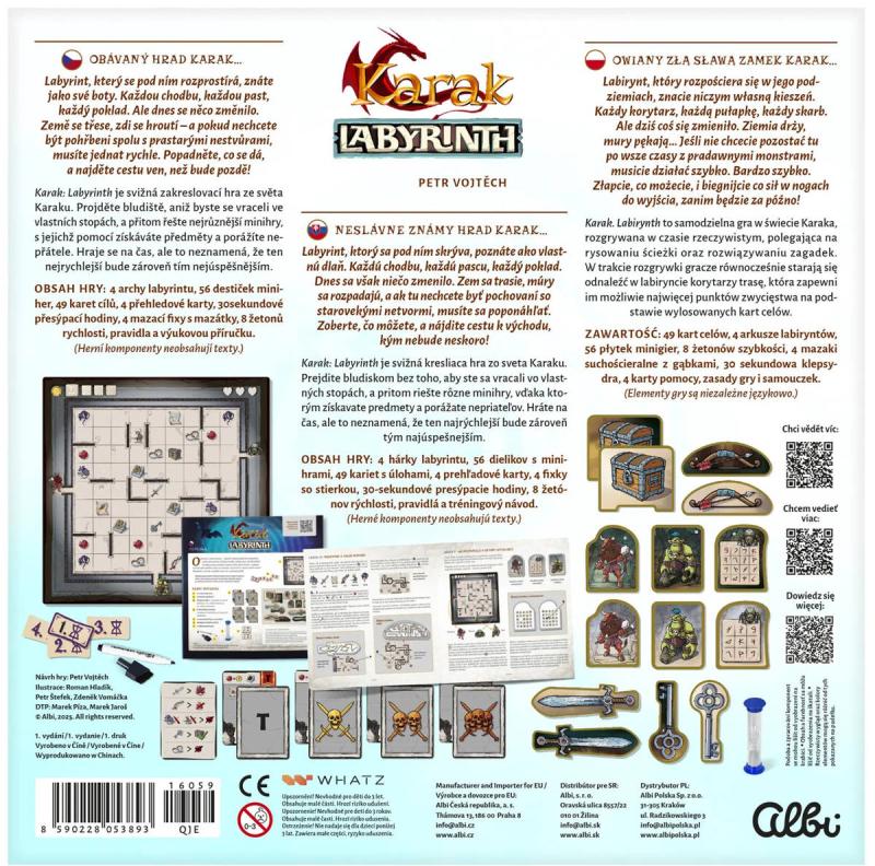 Balení obsahuje: 4 oboustranné popisovací archy labyrintu, 4 mazatelné fixy, 56 popisovacích dílků minihher, 49 karet úkolů, 1 přesýpací hodiny (30s), 8 žetonů rychlosti, 4 přehledové karty, pravidla v českém, slovenském a polském jazyce.