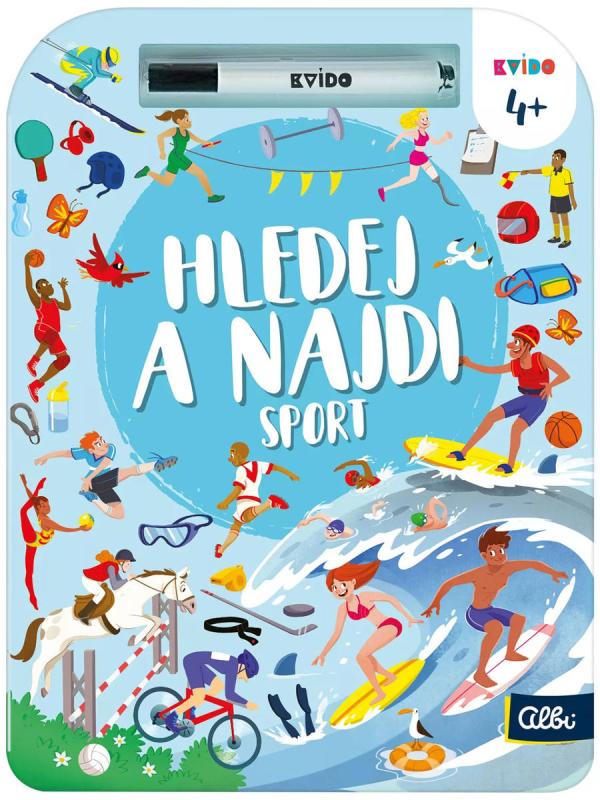 ALBI hra Hledej a najdi: Sport, z edice Kvído. Součástí mazatelný fix.Najděte na každé stránce obrázky, které jsou dole zobrazené. Některé jsou tam dokonce vícekrát a všude se skrývá i nějaký ten vetřelec. Najdete je všechny? Pokud máte už vyplněno, můžete vše smazat a zkusit řešit znovu. Do sešitu se totiž píše fixem, který lze pomocí papírového ubrousku opět vymazat.