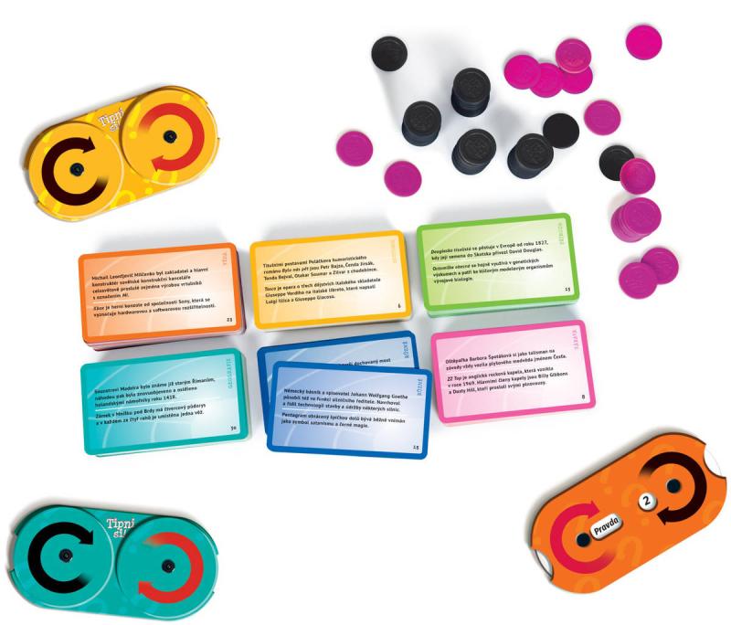 Balení obsahuje: 420 karet s 840 výroky, 6 rozhodovacích destiček, 80 plastových mincí, pravidla