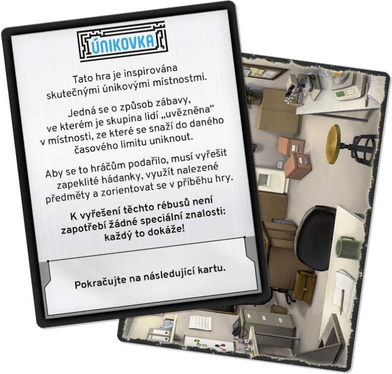 Únikovka je karetní variací na populární únikové hry, při nichž se skupina přátel (nebo kolegů) nechá zamknout do místnosti plné rébusů a snaží se z ní v časovém limitu uniknout pryč. I Únikovka je plná rébusů, které musíte vyřešit chcete-li uspět. A uspějete nebo selžete všichni - v Únikovce totiž hrají hráči spolu a ne proti sobě.
