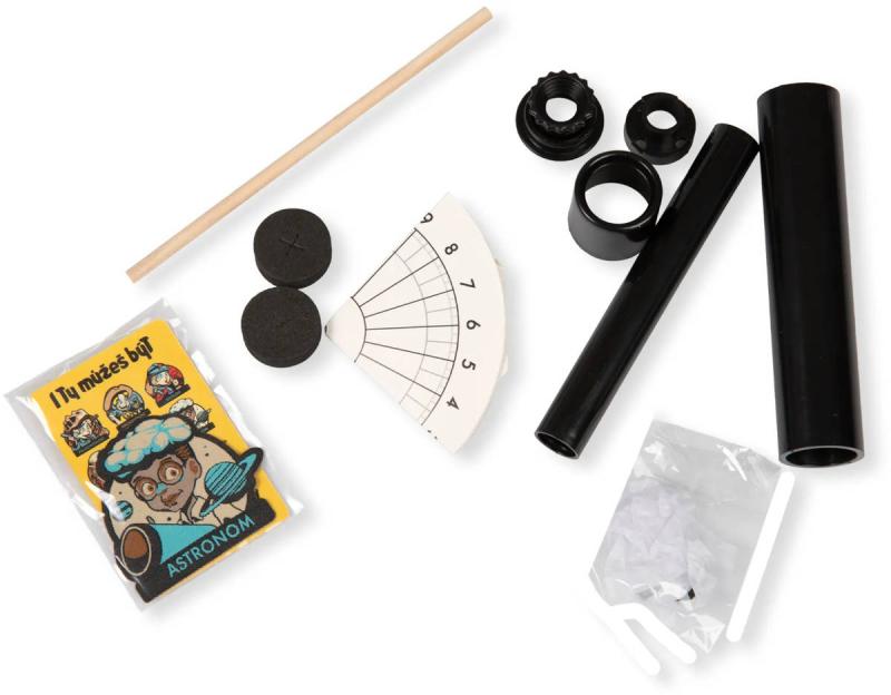 Sada Astronom obsahuje: 2 destičky na sluneční hodiny, 1 gnómón, 1 karton na sluneční hodiny, 1 sadu s dalekohledem, 1 nášivku Astronoma, návod