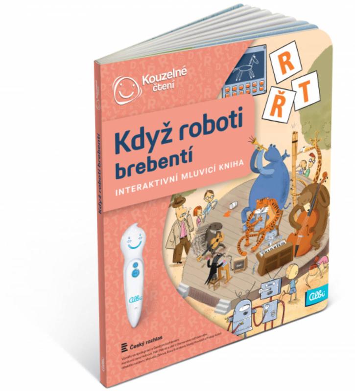 Když roboti brebentí - Interaktivní mluvicí kniha z produktové řady "Kouzelné čtení" od Albi.Interaktivní logopedická kniha. Knihou děti provází dvě postavičky, robot Robi a robotka Otka, které jim s mluvením pomáhají. Spolu s nimi se děti pokouší správně vyslovovat hlásky D, T, N, L, R a Ř. Kniha obsahuje hravé úkoly podněcující děti k mluvení, a tím i k procvičování problematických jevů. Nechybí ani básničky, písničky a napínavé komiksy. Knihu připravila speciální pedagožka, logopedka a autorka mnoha dětských knih Ester Stará. Kniha je namluvena Janou Holcovou, Petrem Pěknicem a dětmi z Dismanova rozhlasového dětského souboru. Kniha obsahuje přes 1500 zvuků a textů.