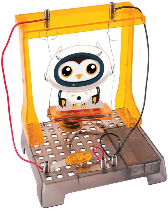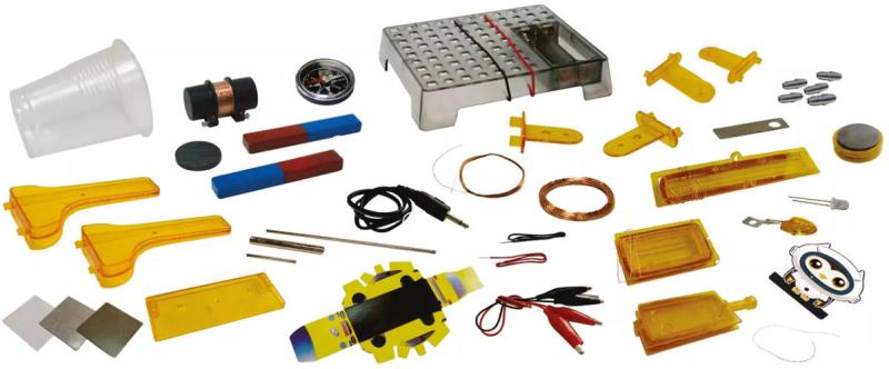 Balení obsahuje: cívku závěsné houpačky, vrchní část závěsné houpačky, nohu závěsné houpačky, vodič, magnet, destičku spínače, kovovou destičku, cívku vahadlové houpačky, nohu vahadlové houpačky, kovový čep, základní desku, pružinové konektory, kartonový výřez figurky, železnou tyč, cívku, vodič s krokosvorkami, cívku motoru, kovový čep, dlouhou nohu vahadlové houpačky, plastový kelímek, malou cívku, kotoučový magnet, sluchátkový konektor, kompas, tyčové magnety, šicí nit, magnetický generátor, LED diodu, kartonový výřez autíčka, plastovou destičku, hliníkovou destičku, železnou destičku, návod.