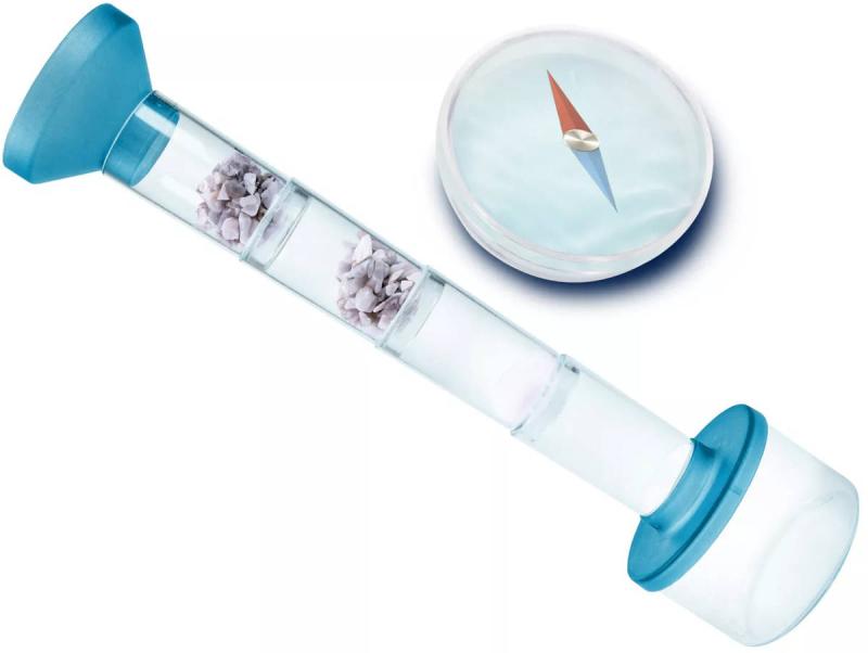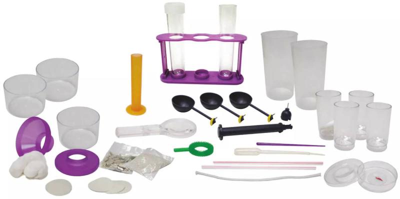 Balení obsahuje: 4 plastové trubice, 1 plastový trychtýř, 1 plastový kryt, 1 plastový kelímek, 1 sáček oblázků, 1 sáček mramorových kamínků, 3 filtrační papíry, 1 houbičku, 2 zkumavky, 1 zátku s otvorem, 1 stojan na zkumavky, 2 brčka, 1 odměrný válec s otvory, 1 Petriho misku, 1 kompas do vody, 3 větrné lopatky ve tvaru košíčku, 1 držák větrných lopatek, 1 madlo větrných lopatek, 2 plastové kelímky, 2 odměrky, 1 pipetu, 1 bavlněný provázek, 1 lupu, 3 vatové kuličky, 1 bublifukovou hůlku, 1 míchací tyčinku, návod