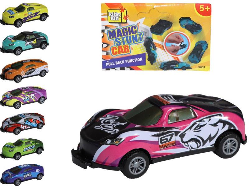 Malé sportovní trikové autíčko závodnička kaskadérská z kovu a plastu, s pohonem na zpětné natažení. Po nárazu do překážky udělá salto. 8 variant provedení.Dětská autíčka, to jsou hračky, které potěší malé i velké. Modely aut zajisté potěší nejen malé děti, ale i dospělé. Vždyť koho by krásný model auta nefascinoval?