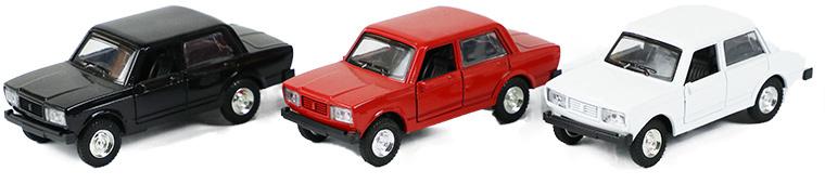 Auto Lada s otevíracími dveřmi, model z kovu a plastu, ve třech barevných variantách. Zatlačením na auto, vydává reálný zvuk a svítí. Auto jezdí na zpětný setrvačník. Hračka na baterie, se světlem a zvukem. Baleno v krabici.