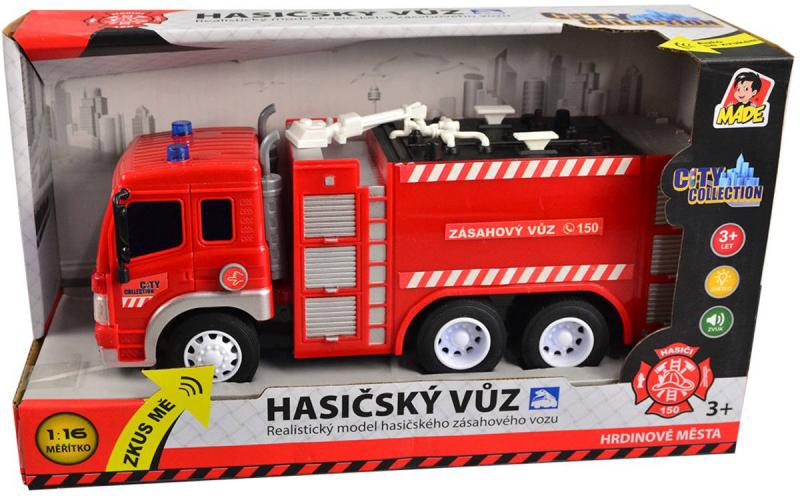 Auto požární cisterna o velikosti 26cm. Realistický model z kolekce City Collection, hasičský zásahový vůz na baterie, se světlem a zvukem.City Collection představuje hasičské auto na baterie, které svítí a vydává zvuk. Auto je nápomocné při dopravních nehodách, požárech nebo v těžko dostupných místech (např. ve výškách). Staň se velitelem hasičských vozů a zachraňuj životy!