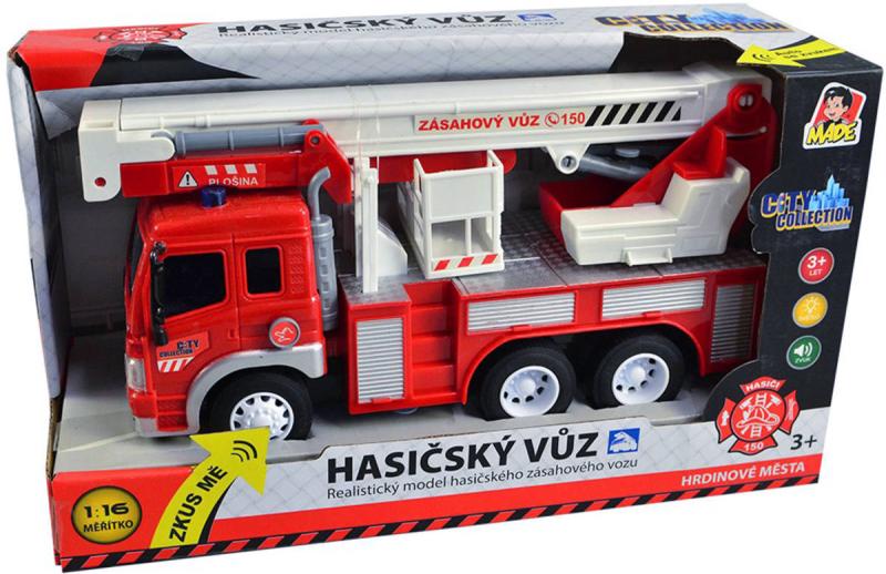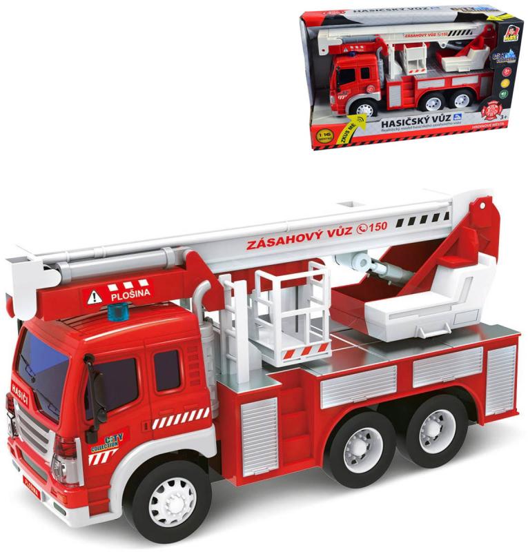 Auto požární s plošinou o velikosti 25cm. Realistický model z kolekce City Collection, hasičský zásahový vůz na baterie, se světlem a zvukem.City Collection představuje hasičské auto na baterie, které svítí a vydává zvuk. Auto je nápomocné při dopravních nehodách, požárech nebo v těžko dostupných místech (např. ve výškách). Staň se velitelem hasičských vozů a zachraňuj životy!