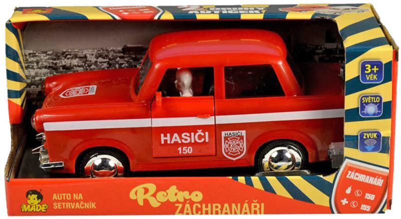 Červené hasičské autíčko na setrvačník z kolekce Retro záchranáři. Baleno v openboxu.Plastové auto v červeném designu aut retro hasičů s pohonem na setrvačník. Auto po stisknutí vydává zvuk motoru. Otevírací dveře. Český box. Hračka na baterie, se světlem a zvukem.
