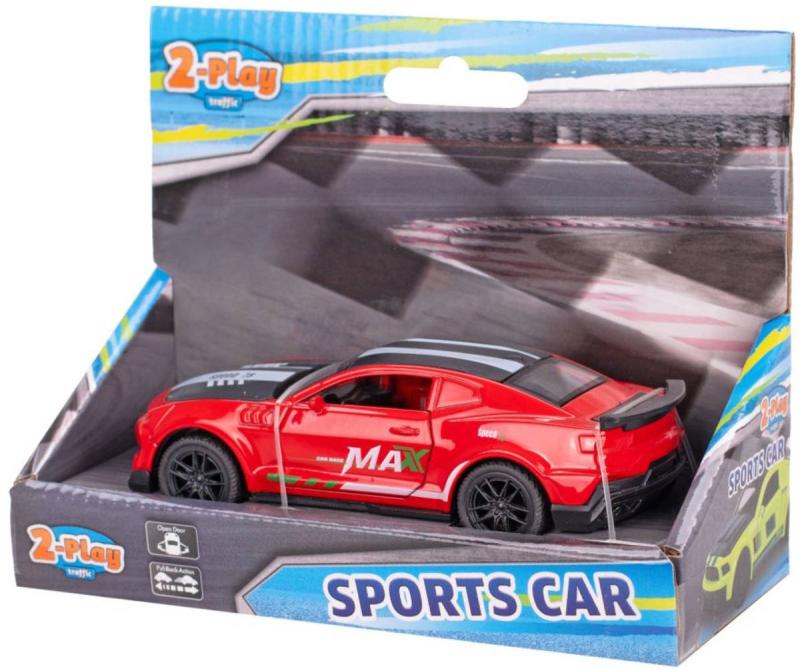 Kovový sportovní automobil 2-Play Traffic s pohonem na zpětný chod. Model z kovu a plastu o velikosti 12cm. 4 varianty provedení. Otevírací dveře.
