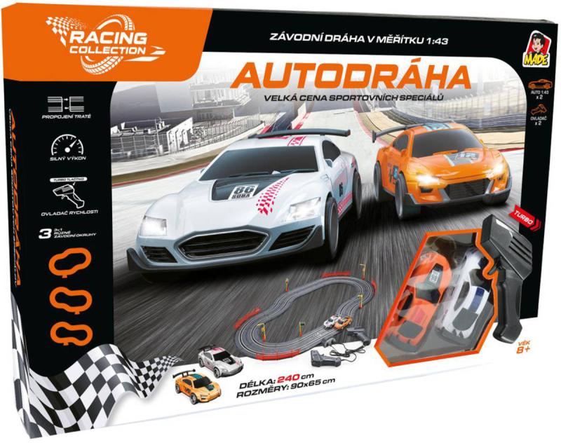 Autodráha je skvělou zábavou pro děti co mají rády rychlou jízdu pro všechny malé i velké závodníky. Autodráha z produktové řady Racing Collection obsahuje 2 auta závodní speciály, 2 ovladače, s USB kabelem pro externí napájení a s příslušenstvím, délka trati 240 cm. Vše je baleno v českém boxu.