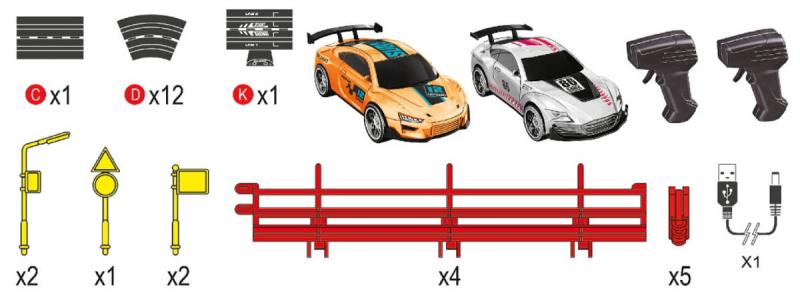Obsah balení: auto 2x, ovladač 2x, USB nabíjecí kabel, dráha s doplňky k sestavení