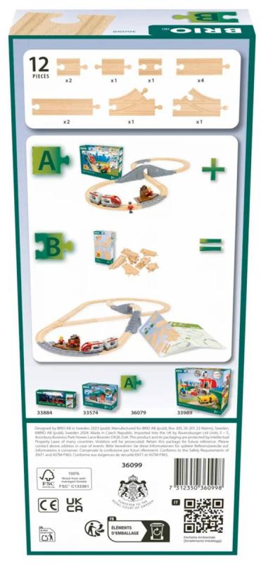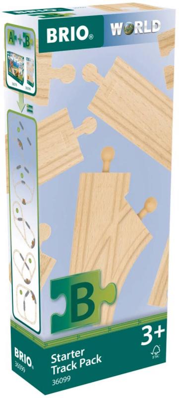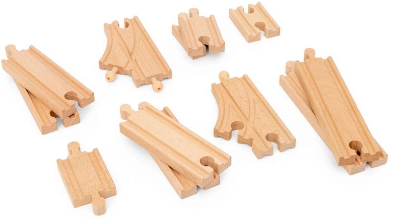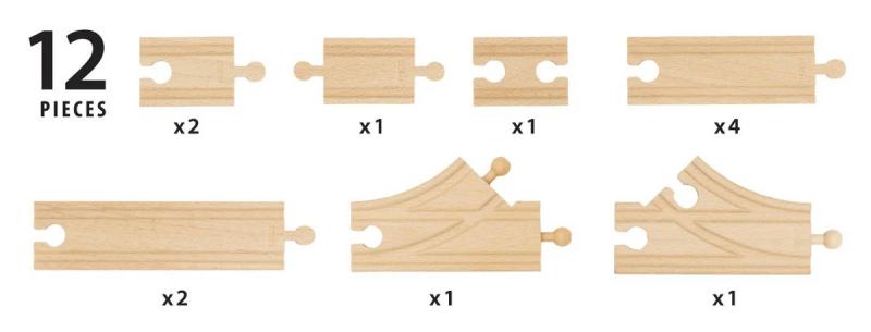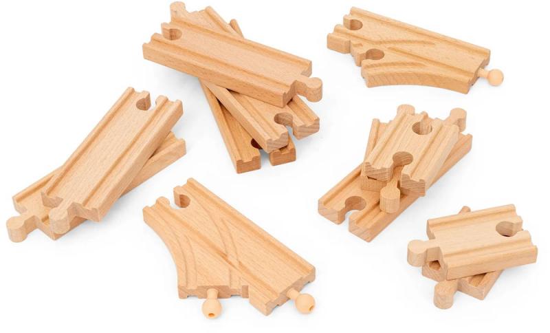BRIO 36099 - Startovací sada kolejnic. Dřevěné koleje 12ks - Doplněk k vláčkodráze (rovná kolej, výhybka).Sada obsahuje výběr dřevěných dílů, které lze použít k vytvoření dalších pěti typů uspořádání tratí se 36079 Startovacím osobním vlakem (prodává se samostatně). Kombinujte různé délky přímých kolejnic, výhybek a spojovacích kolejnic.