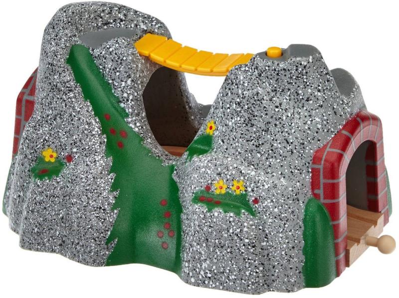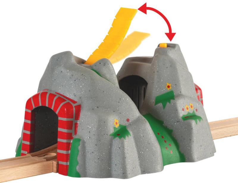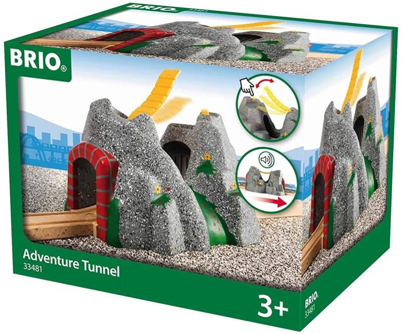 BRIO 33481 - Akční tunel ve skále s lávkou s manuální funkcí - příslušenství k dráze. Při průjezdu vlaku se spustí zvukové efekty. Hračka na baterie, se zvukem. Baleno v krabici.Dobrodružný tunel se zajímavým vzhledem skály jejichž dva vrcholy spojuje lávka obsahuje kromě schovaných kolejí, také automatický magnetický zvukový systém, který po vjetí soupravy dovnitř tunelu, začně vydávat 4 různé zvukové efekty (houkání před tunelem a v tunelu, práci v tunelu a funění lokomotivy).