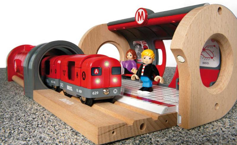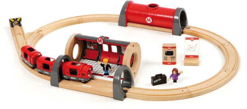 Tato Brio souprava metra s nástupištěm a kolejemi potěší každého chlapce. Sada obsahuje kruhové koleje, tunel, nástupiště, metro s třemi vozy, automat na jízdenky, plánek metra a 2 figurky, které představují cestující. Metro jezdí velmi rychle a nechybí mu zvukový a světelný doprovod. Celá sada je krásně a realisticky zpracovaná do těch nejmenších detailů. Tato souprava je kompatibilní s ostatními dřevěnými