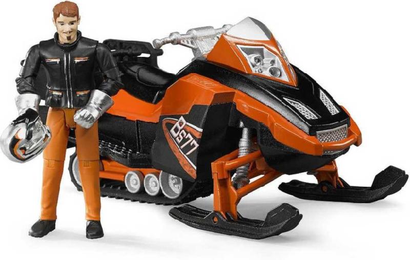 Bruder oranžový sněžný skútr s figurkou má dvojité sedadlo pro 2 figurky BWORLD, dva držáky nářadí, odnímatelné závěsné zařízení, odnímatelné držáky batohů s uchycením krabic s nářadím. Skútr má gumové pásy a zatáčecí lyžiny. Figurka řidiče má helmu a rukavice.