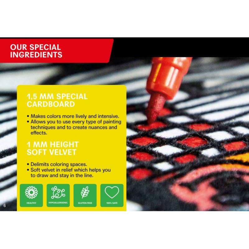 Velký sametový obrázek k vybarvení, motiv koňské hlavy. Vybarvovací šablona je ze sametu, který usnadňuje vybarvení. Obrázek můžete vybarvit fixami, pastelkami nebo voskovkami. Okraje motivu jsou přesně vymezeny sametem a zabraňují přetahování okrajů.