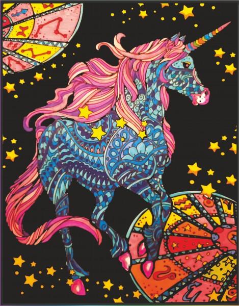 Velký sametový obrázek k vybarvení, motiv jednorožce. Vybarvovací šablona je ze sametu, který usnadňuje vybarvení. Obrázek můžete vybarvit fixami, pastelkami nebo voskovkami. Okraje motivu jsou přesně vymezeny sametem a zabraňují přetahování okrajů.