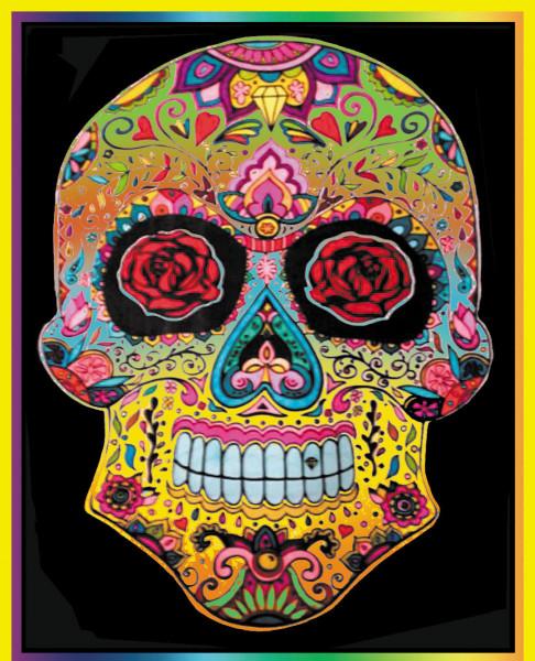 Velký sametový obrázek k vybarvení, motiv lebky. Vybarvovací šablona je ze sametu, který usnadňuje vybarvení. Obrázek můžete vybarvit fixami, pastelkami nebo voskovkami. Okraje motivu jsou přesně vymezeny sametem a zabraňují přetahování okrajů.