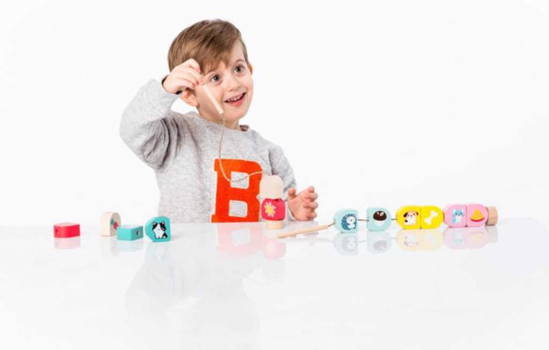 jedné straně a zarážkou na druhé straně. Cílem je najít ke každému zvířátku jeho oblíbené jídlo a oba dřevěné prvky navléci tak, aby tvořily pár.