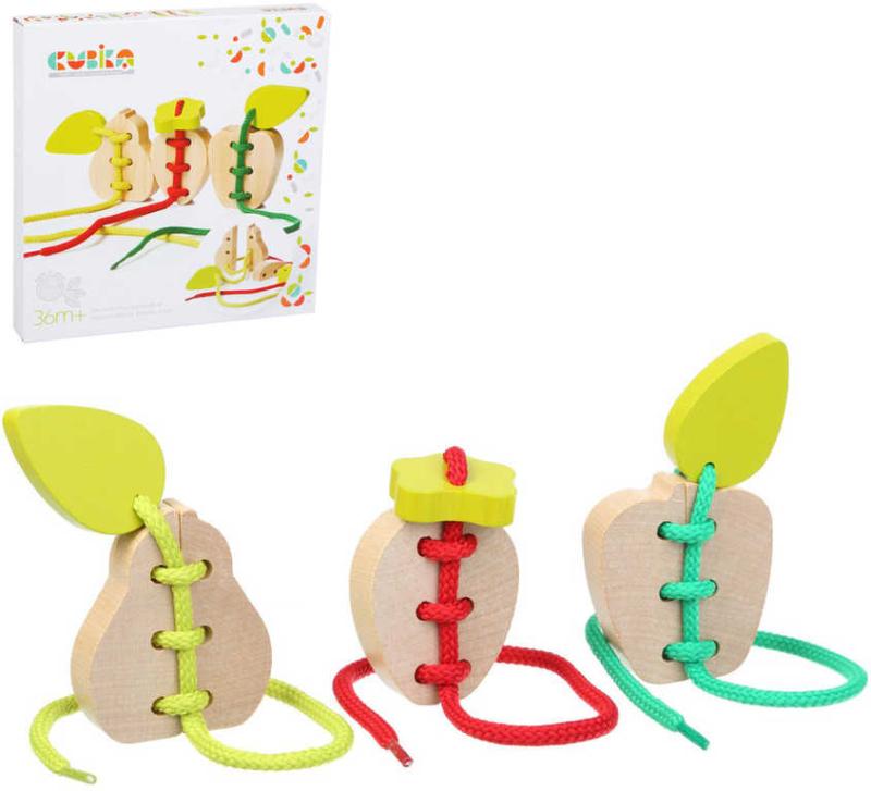 CUBIKA 14811Navlékání je perfektní činnost pro procvičování malých dětských prstíčků. Zároveň si tím děti trénují trpělivost a v případě provlékačky ovoce značky Cubika i kreativitu. Balení této sady 3 dřevěných šněrovacích hraček