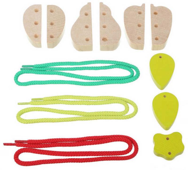 obsahuje 6 dřevěných prvků a 3 navlékací tkaničky, kterými by se měly jednotlivé dílky k sobě správně svázat tak, aby vznikla hruška, jahoda a jablko.