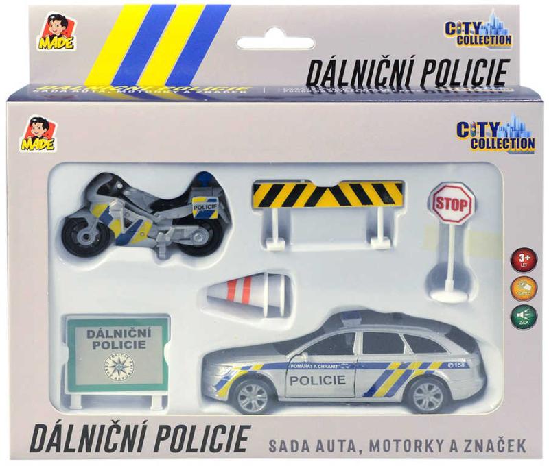 Sada dálniční policie City Collection v českém designu. Znáte z našich silnic. Policejní auto (kov), motorka (plast), značky (plast) z produktové řady City Collection. Auto s funkčním majákem (světlo, zvuk). Skvělá hračka pro malé strážce zákona. S takovým vybavením bude každý pirát silnic okamžitě zadržen. Pohon na zpětné natažení. Český desgin. Český box.