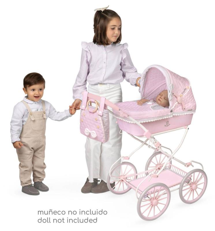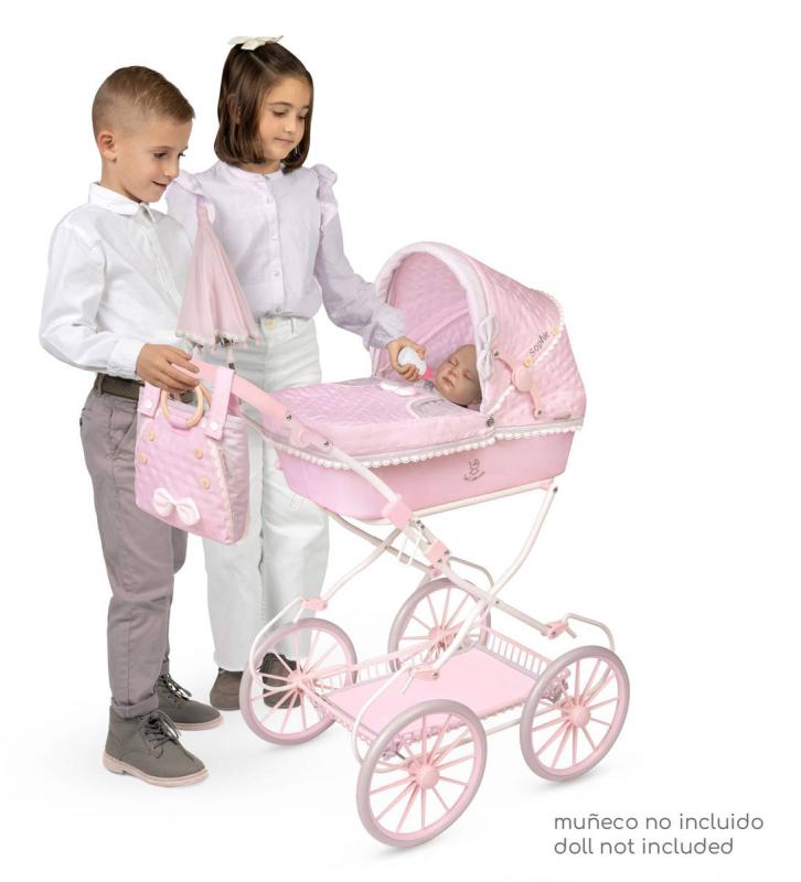DeCuevas 81075 Skládací kočárek pro panenky s taškou a doplňky Sophie 2025 - 81 cm ze stejnojmenné kolekce, která je novinkou roku 2025, je díky vysoké rukojeti spíš vhodný pro větší slečny. Něžná dívčí kolekce Sophie je nepřehlédnutelná pro každé děvčátko. Světle růžová barva dominuje celé kolekci. Doplněná je o světle šedivé a bílé kraječky a mašličky, které zdobí všechny výrobky této rozmanité kolekce a ještě více podtrhují nádech romantiky. Kolekce nabízí nejen zmíněné kočárky, ale i jiné doplňky pro malé slečny a jejich panenky. Jeho designové zpracování ho řadí mezi kočárky zakoupené i pro sběratelské účely. Nádherný španělský design, precizní zpracování. Skládací model, velmi snadná manipulace během samotné hry. Materiál: kov, plast, textil. Baleno v krabici v barvách kolekce.
