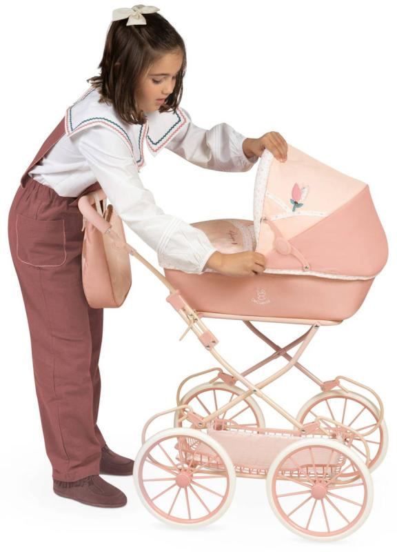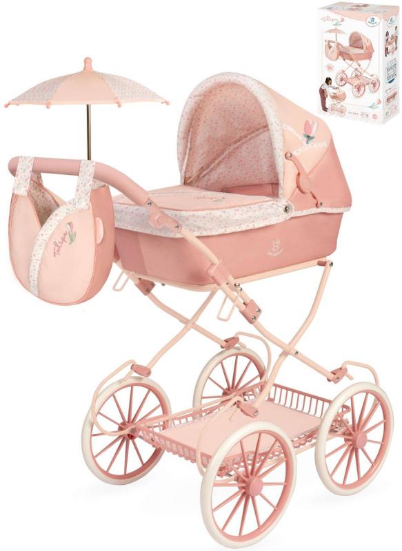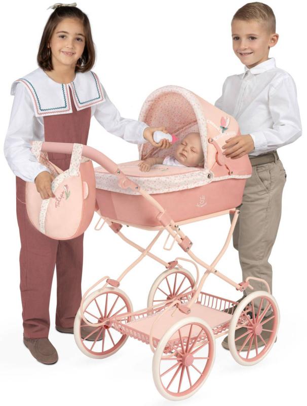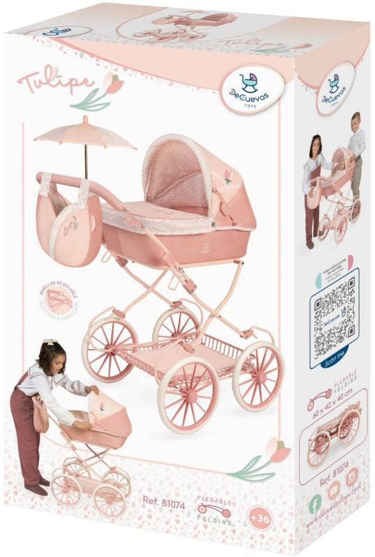 DeCuevas 81074 Skládací kočárek pro panenky s taškou a doplňky Tulipe 2025 - 81 cm ze stejnojmenné kolekce, která je novinkou roku 2025, je díky vysoké rukojeti spíš vhodný pro větší slečny. Tulipe je, jak již sám název napovídá, kolekce plná tulipánů v překrásně sladěných teplých pastelových lososových barvách. Světlejší a tmavší odstíny barev jsou vkusně doplněné drobným květinovým vzorem ve stejných tónech na bílosmetanovém podkladu. Tento motiv ještě navíc u kočárků umocňují svým tematickým tvarem i překrásné, jako tulipán vypadající tašky. Květ tulipánu zdobí i dřevěné výrobky této kolekce. Tato kolekce nabízí výběr výrobků od jídelních sad přes postýlky a kočárky až po dřevěný nábytek pro panenky. Jeho designové zpracování ho řadí mezi kočárky zakoupené i pro sběratelské účely. Nádherný španělský design, precizní zpracování. Skládací model, velmi snadná manipulace během samotné hry. Materiál: kov, plast, textil. Baleno v krabici v barvách kolekce.