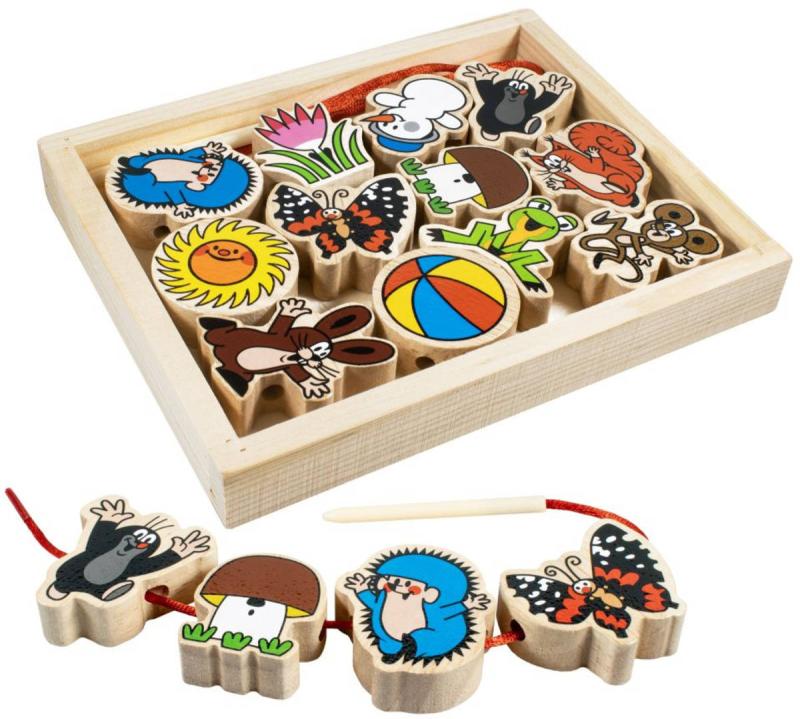 Dřevěná provlékačka Krteček pro nejmeněí děti. Součástí 12 navlékacích dílků a provázek s dřevěnou jehlou. Baleno v dřevěné krabici.