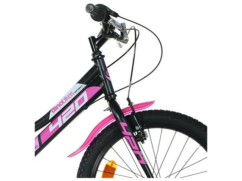 Juniorské kolo Dino Bikes sa vyznačuje prepracovaným dizajnom dávajúcim kolu športový vzhľad. Veľkou výhodou všetkých našich kolies talianskej výroby je, ŽE SÚ NASTAVENÉ PRE PREVÁDZKU A NA 95 % ZOSTAVENÉ. Zostáva iba nasadiť riadidlá, sedlo a pripevniť prípadne blatníky (ak sú súčasťou kola). Kolo má hliníkové ráfiky 20 palcov = 51 cm, dvojvrstvové nafukovacie plášte s jemným vzorom na cestu i do nenáročného terénu o rozmeroch 20' x 2,125', voľnobeh na zadnom kolese. Sedlo je možné nastaviť do výšky 56 - 68 cm. Kolo je vyrobené s odľahčeným vystuženým rámom z Hi-ten ocele. Súčasťou výbavy je stojan na kolo. Kolo má predné a zadné veľmi účinné 'V-brzdy' a otočné Grip Shift - šesťstupňové prevody Shimano TZ-20 so 14/28 zubmi s radením na rukovätiach riadidiel. Na kole sú dva malé plastové blatníky a tenký kryt reťaze v farbe kola. Hmotnosť je 11,7 kg. Nosnosť kola je 100 kg. Kolo je vyrobené v EÚ a má všetky bezpečnostné certifikáty. Farba kola je čierno ružová príťažlivá kombinácia.8006817906483175.38