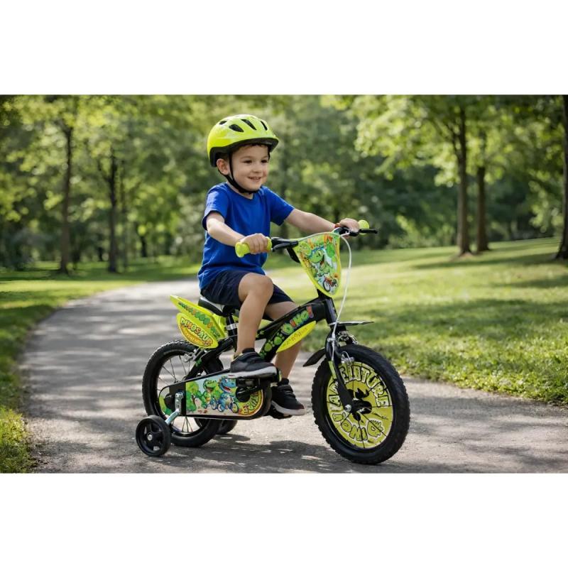 Začnite veľké preteky so svojím dinosaurovým bicyklom, ktorý je navrhnutý pre malých cyklistov vo veku 4 až 5 rokov s výškou 95 až 115 cm.\n\nRám bicykla je pevný a robustný, aby vydržal intenzívne používanie aj pri aktívnej jazde detí. Bicykel je vybavený odnímateľnými pomocnými kolieskami, ktoré zabezpečujú stabilitu a pomáhajú deťom získať istotu pri učení jazdy.\n\nKryt reťaze chráni dieťa pred možnými zraneniami spôsobenými pohybujúcim sa reťazou a zároveň prispieva k atraktívnemu vzhľadu bicykla. Dizajn s motívom dinosaura je doplnený živými a pútavými grafickými prvkami, ktoré upútajú pozornosť a podporia detskú predstavivosť.\n\nVyrobené v Taliansku, kde sú bicykle Dino Bikes pravidelne testované a certifikované podľa najprísnejších európskych noriem, čo zaručuje bezpečnosť a pohodlie vášho dieťaťa.\n\nTechnické špecifikácie:\n\n• Brzdy: 2 čelusťové brzdy pre spoľahlivé zastavenie\n• Pneumatiky: nafukovacie s priemerom kolies 14" (34 cm), vhodné pre jazdu na rôznych povrchoch\n• Ráfiky: kompozitné (polypropylén a nylon) odolné proti poškodeniu\n• Pomocné kolieska: odnímateľné, uľahčujú učenie a zabezpečujú stabilitu\n• Kryt reťaze: chráni pred zranením a udržiava čistotu\n• Hmotnosť: 8,3 kg, čo je primerané pre ľahkú manipuláciu deťmi\n• Maximálna nosnosť: 50 kg\n• Vybavené tiež blatníkmi a štítom pre lepšiu ochranu\n\nFirma Dino Bikes pôsobí na trhu od roku 1920 a patrí medzi najvýznamnejších európskych výrobcov detských bicyklov. Tento model kombinuje osvedčenú kvalitu a bezpečnosť s atraktívnym dizajnom, ktorý deti baví.\n\nVďaka kombinácii pevnej konštrukcie, bezpečnostných prvkov a vhodných rozmerov je toto kolo ideálnou voľbou pre malých začínajúcich cyklistov, ktorí chcú bezpečne a s radosťou objavovať svet na dvoch kolesách.\n\nVyberte deťom spoľahlivého spoločníka na ich prvé cyklistické dobrodružstvá, ktorý ich podporí na ceste k samostatnej jazde.