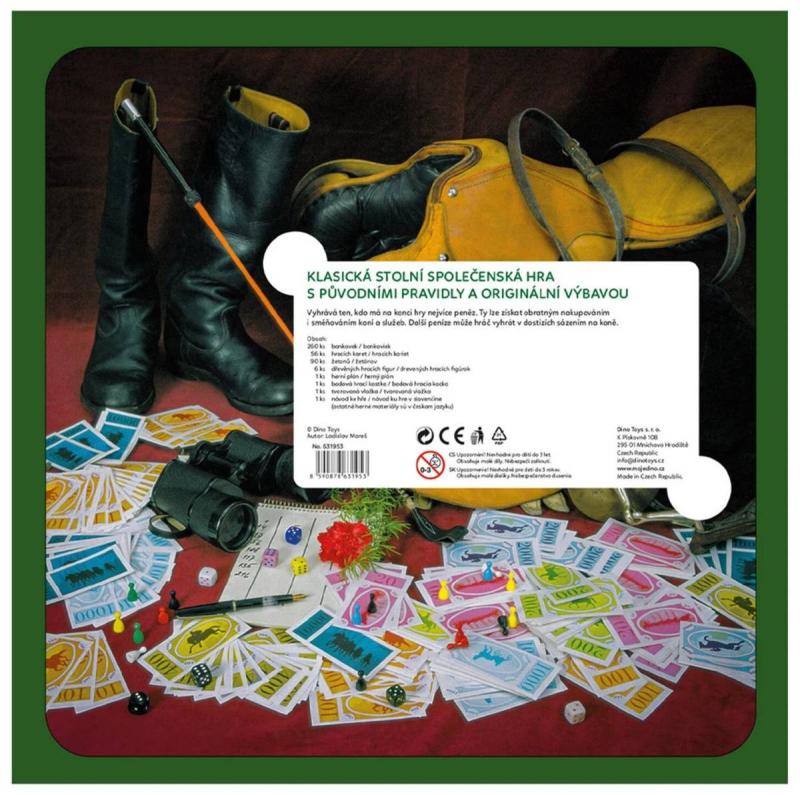 V klasickém kufříku opět najdete velký skládací herní plán, dřevěné figurky, původní ilustrace a známý design dostihových peněz. Nechybí ani vložka nebo návod v originálním znění. Vraťte se s námi zpátky v čase a oživte vzpomínky na napínavá dostihová klání!