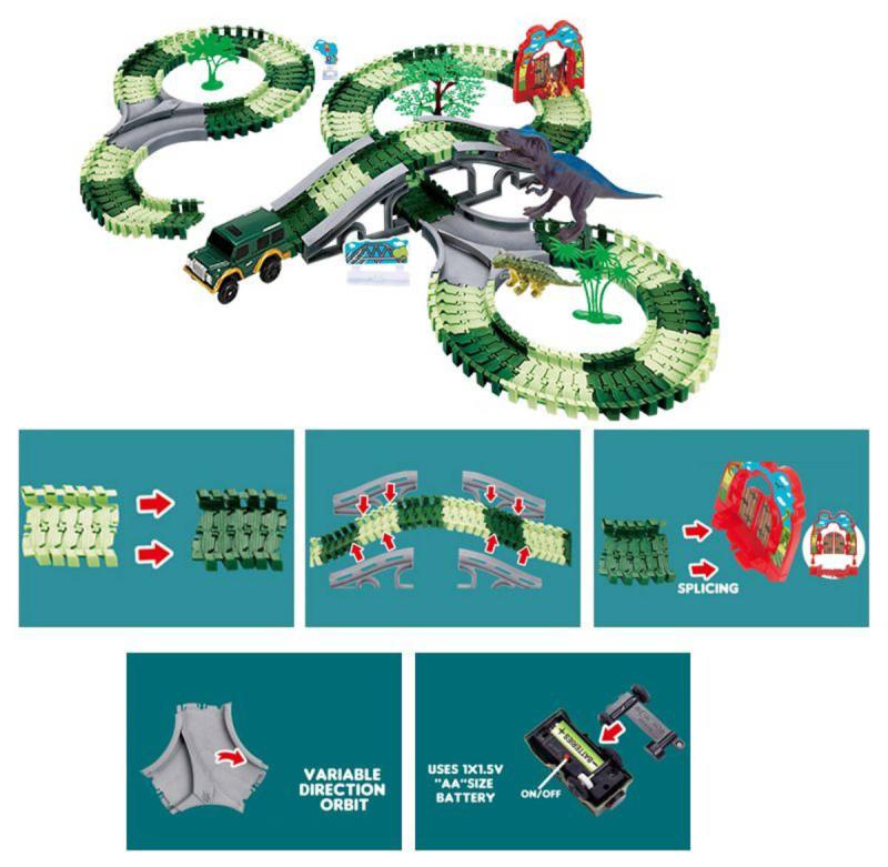 Variabilní dinosauří plastová dráha s nadjezdem a výhybkou, která má celkem 217 dílů. Součástí setu je i jedno autíčko. Tato dráha je velice jednoduchá na sestavení. Dráha se dá poskládat podle vlastní fantazie. Barevné, měkké, ohebné dílky. Rozvíjí představivost i manuální zručnost dítěte. Hračka na baterie. Baleno v krabici.Rozměry balení (š v h): 41,5 x 29 x 8cm