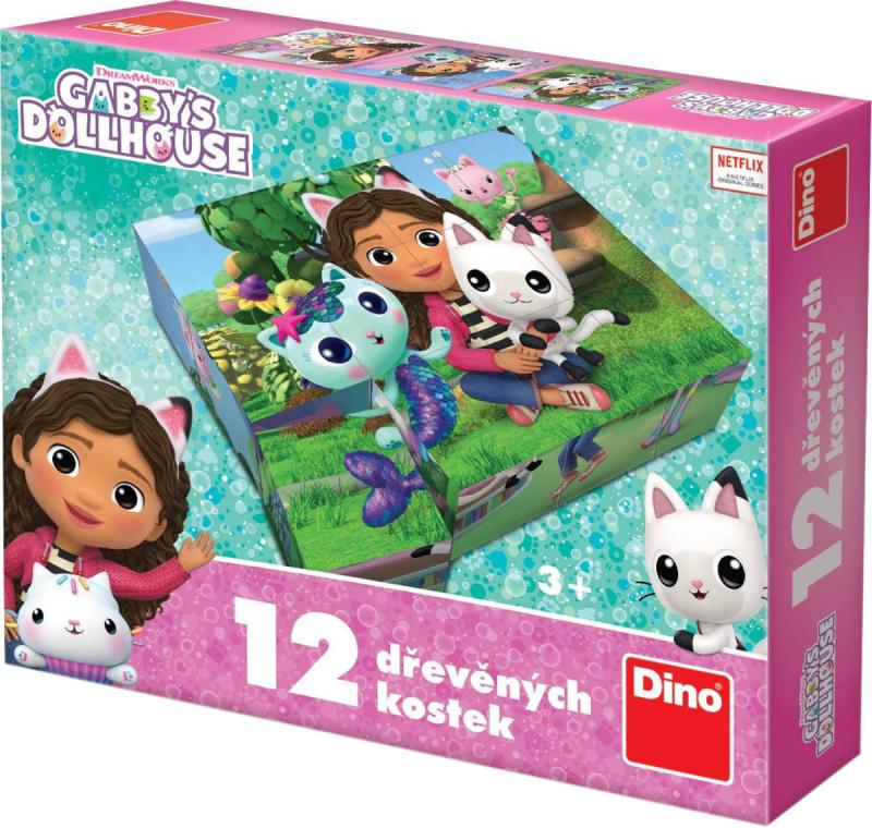Dřevěné obrázkové kostky kubus 12ks s motivem Gábinin kouzelný domek (Gabbys Dollhouse).Znáte všechny místosti Gábina kouzelného domku? Že ne? Nezoufejte. Stačí si s dětmi poskládat sadu 12 dřevěných obrázkových kostek s jednotlivými místnostmi a zahradou Gábina domku. Kouzelným domečkem vás provede nejen Gábi, ale i její věrné kočičí společnice. 12 kostek poslouží nejen jako skládačka, ale i jako stavební materiál na kočičí domeček. Dítka se u nich skvěle zabaví, a přitom potrénují motorické schopnosti a představivost. Ke všem šesti obrázkům jsou v krabičce také předlohy. Skládačka byla vyrobena v ČR a je určena pro tvořivé děti od 3 let.