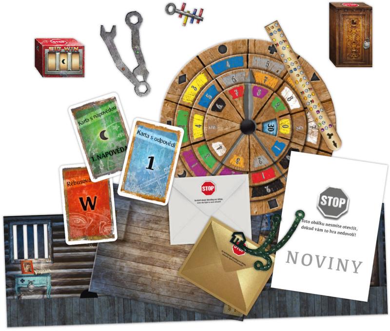Obsah balení: 83 karet, 23 rébusových karet, 30 karet s odpovědí, 30 karet s nápovědou, 5 zvláštních předmětů, 2 kusy nábytku, stěna chaty, podlaha chaty, 3 složené listy, dešifrovací kotouč