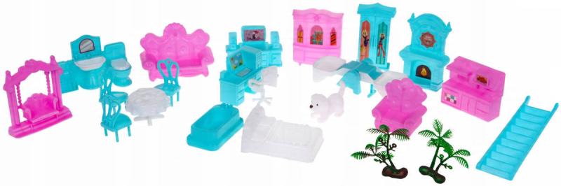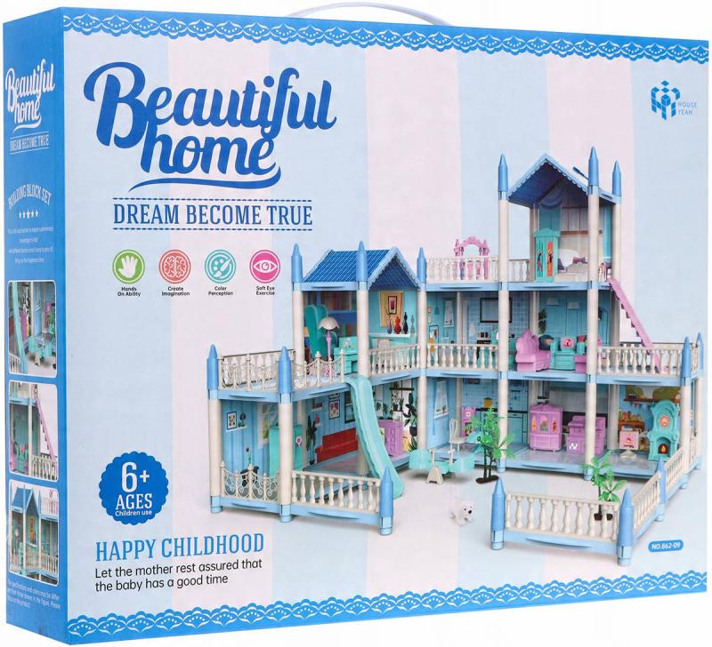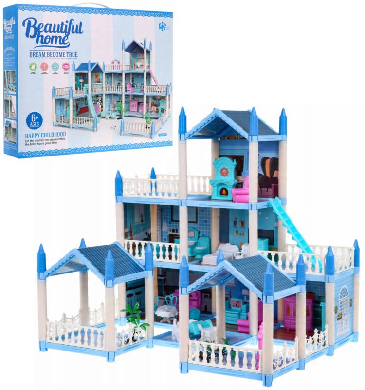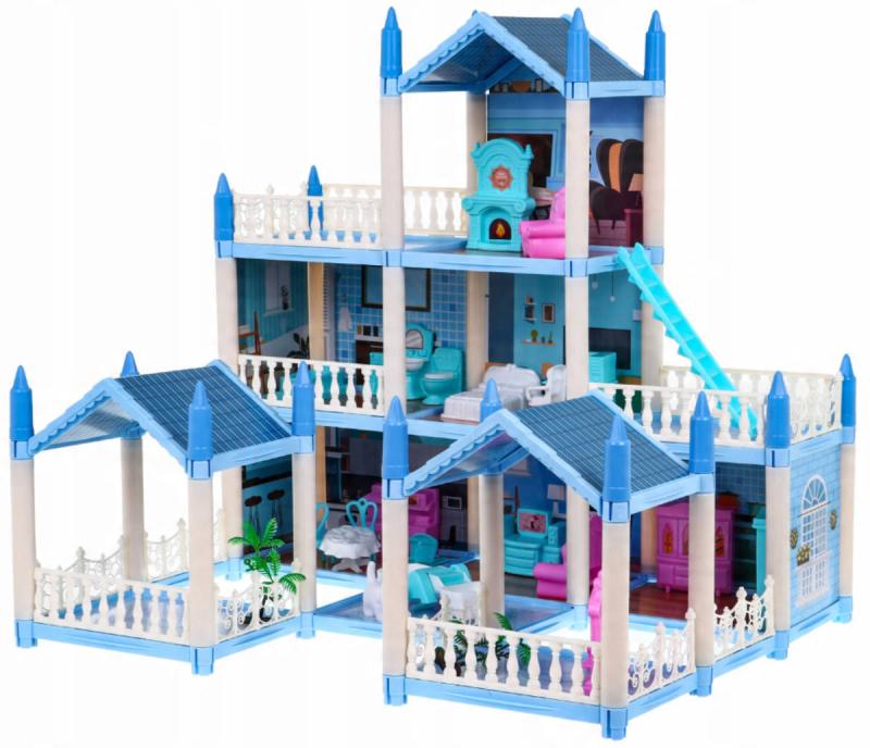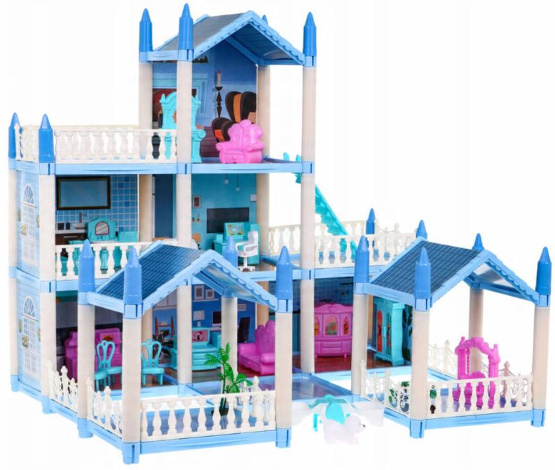 Domeček pro panenky, třípatrový, s nábytkem. Modrá vila s vybavením. Nádherný tříúrovňový domeček k vlastnímu sestavení, určený pro děti od 6 let. Domeček se skládá ze šesti místností: ložnice s terasou, pracovny, obývacího pokoje s terasou, koupelny, kuchyně a jídelny. Venku se nachází také prostor s krbem a dětské hřiště s dvoumístnou houpačkou. Veškeré vybavení domečku je součástí sady.