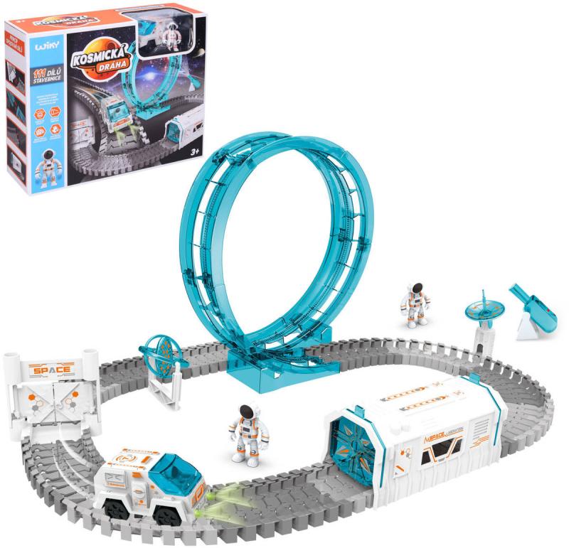 Snadno sestavitelná vesmírná plastová dráha, v sadě s autíčkem, kosmonautem a funkčním projektorem. Hračka na baterie, se světlem.Vydej se na vesmírnou misi s touto parádní kosmickou dráhou, která tě vezme na nezapomenutelnou cestu za hvězdami! Při průzkumu vesmíru tě čeká pořádné dobrodružství doprovázené světelnými efekty! V malé kosmické dráze samozřejmě nechybí ani auto, kosmonaut a funkční projektor! Co by to bylo za průzkum bez potřebného příslušenství! Dráhu si můžeš sestavit do různých tvarů, záleží tedy jen na tobě!