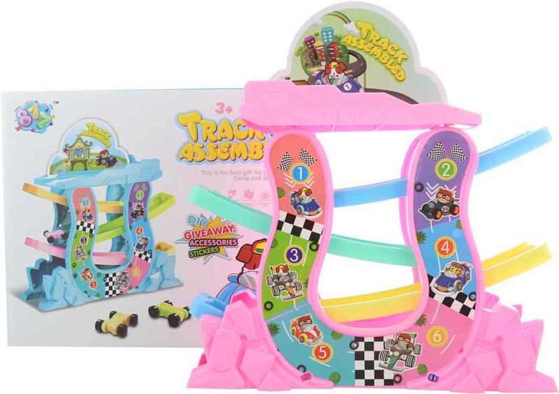 Plastová dráha klouzačka s překlápěcími autíčky. Pestrobarevná závodní dráha v růžové barvě, kde autíčka sjíždí jednotlivá patra až dojedou do cíle. Součástí balení jsou 4 barevná autíčka.