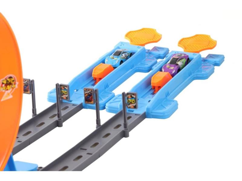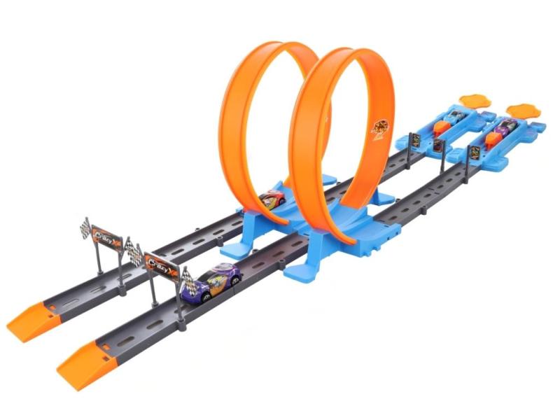 Dvojitá plastová vystřelovací dráha s kovovými autíčky. Lze nastavit 4 stupně výstřelu. Balení obsahuje také 4 kovová autíčka.