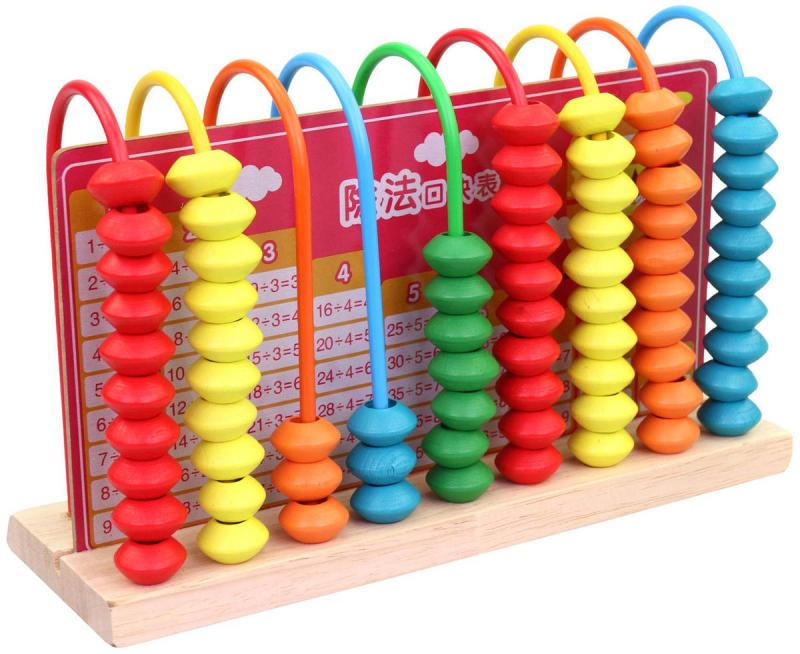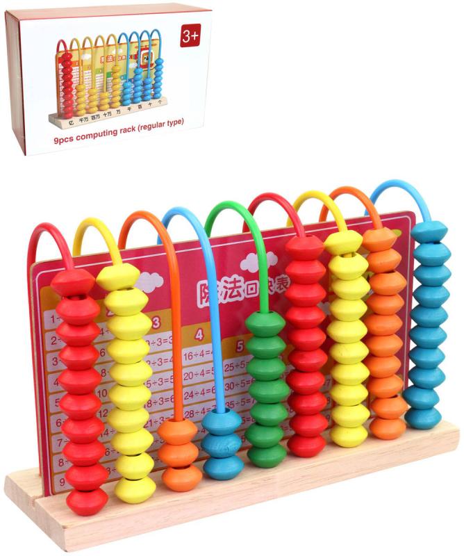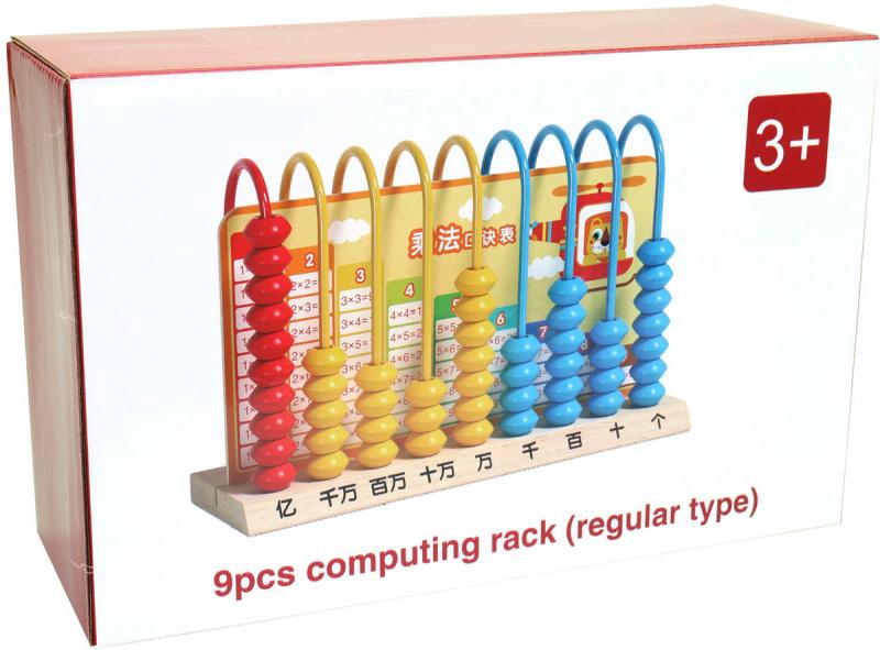 Pestře barevné dřevěné počítadlo je pomocník pro začínající matematické experty. Počítadlo má devět sloupků s deseti dřevěnýma korálkama a tabulku s několika vzorových příkladů.