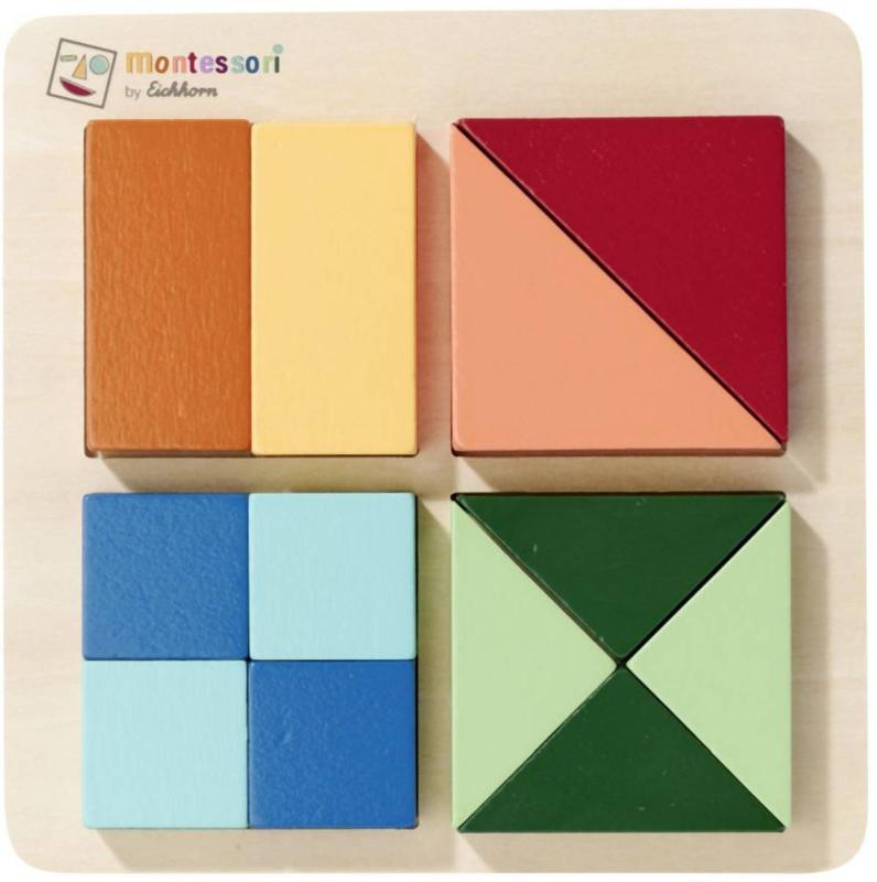 Montessori čtvercové geometrické puzzle nejsou jen pastvou pro oči. Deska se skládá ze 4 čtverců a obsahuje 12 dílků různých tvarů a barev. Cílem skládačky je vyplnit plochu čtverce. Dílky lze také míchat dohromady v různých barvách. Puzzle čtvercová skládačka Montessori je vyrobena ze 100% březového a lipového dřeva s certifikátem FSC a jsou vhodné pro děti od 2 let.