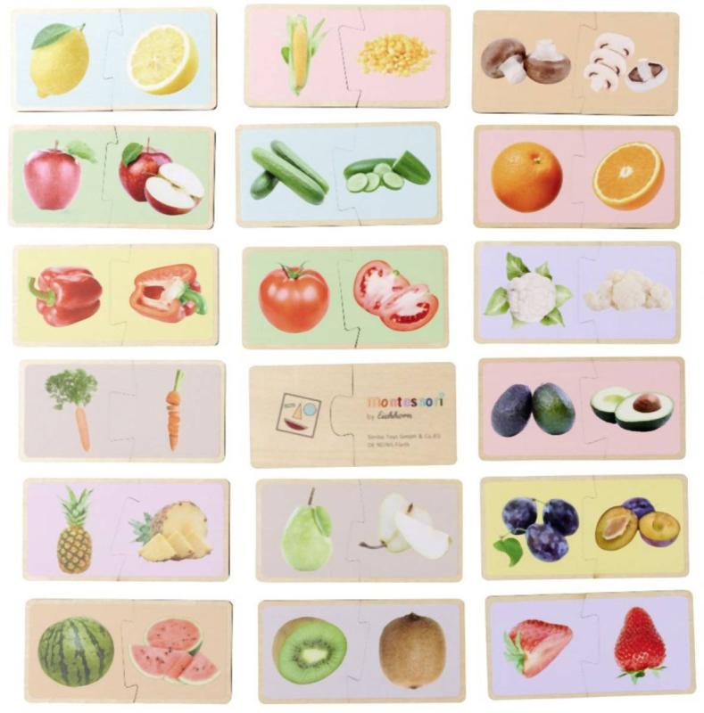 S těmito atraktivními dřevěnými puzzle z řady Montessori se vaše dítě naučí poznávat různé druhy ovoce a zeleniny. Shodné dvojice dílků musí poskládat a poté správně pojmenovat. Na 36 dílcích jsou natištěny realistické obrázky ovoce a zeleniny, které mohou děti vidět v každodenním životě. Dřevěné puzzle Montessori jsou vyrobeny ze 100% kvalitního lipového dřeva s certifikátem FSC a jsou vhodné pro děti od 2 let.