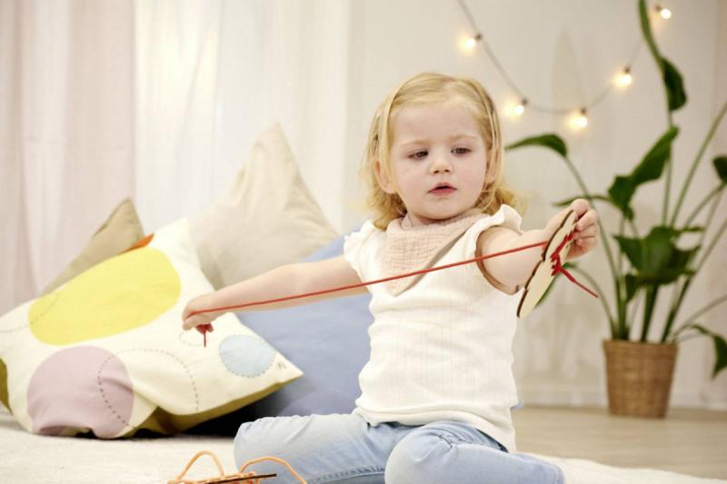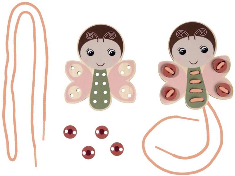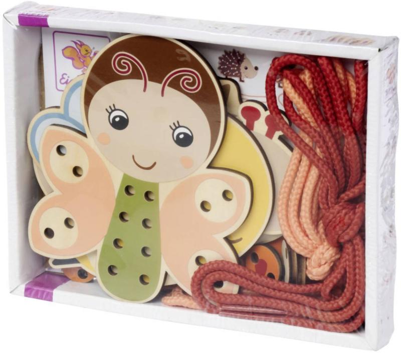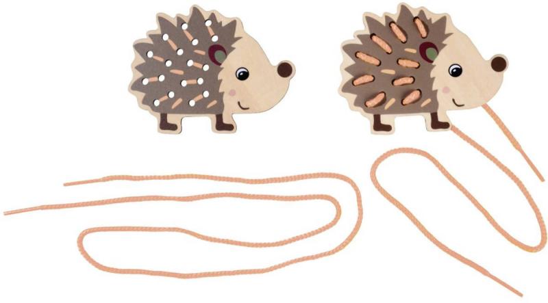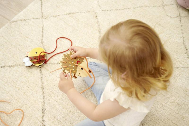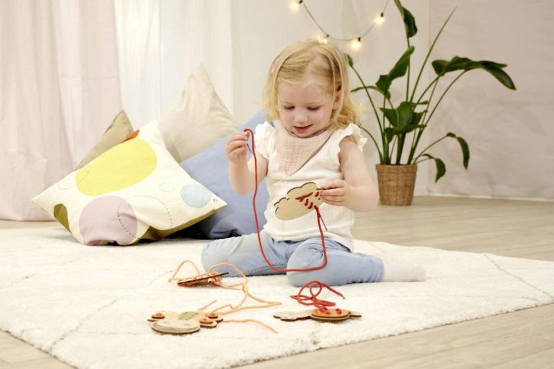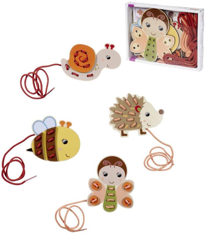 Součástí sady jsou čtyři roztomilá dřevěná zvířátka s otvory a šňůrky k navlékání, díky které mohou děti vytvářet různé kombinace – od jednodušších po složitější. Tento proces rozvíjí zručnost, trpělivost a koordinaci ruka / oko, a zároveň podporuje poznávání barev, tvarů a vzorů.
